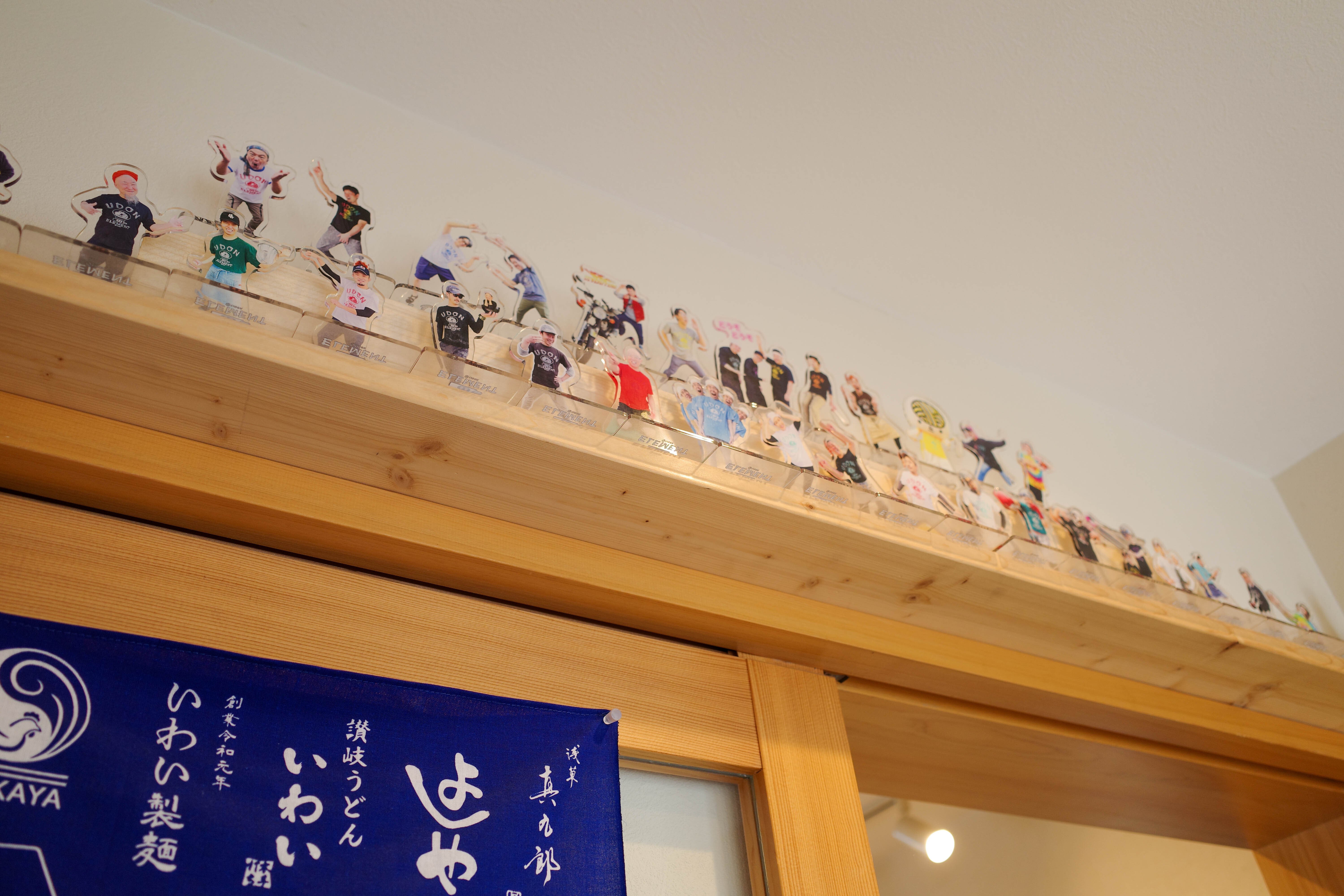 入り口すぐの待合スペースで上を見上げると、うどん屋店主のアクキーがずらり。讃岐うどん文化は横のつながりも強いとよく聞きますが、こういうところを見ると「お互いを高め合って今のうどん大国があるんだな」と感じます。