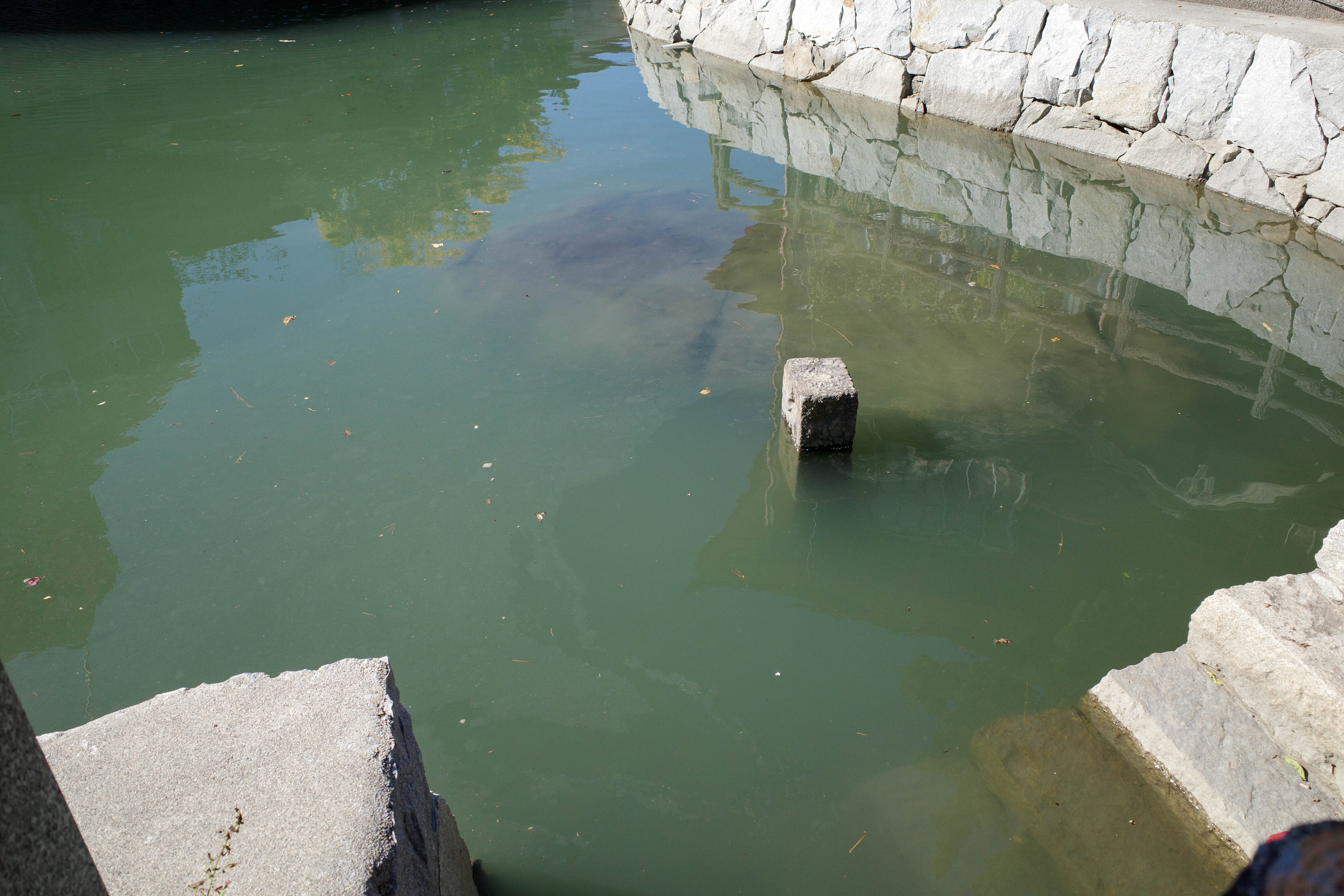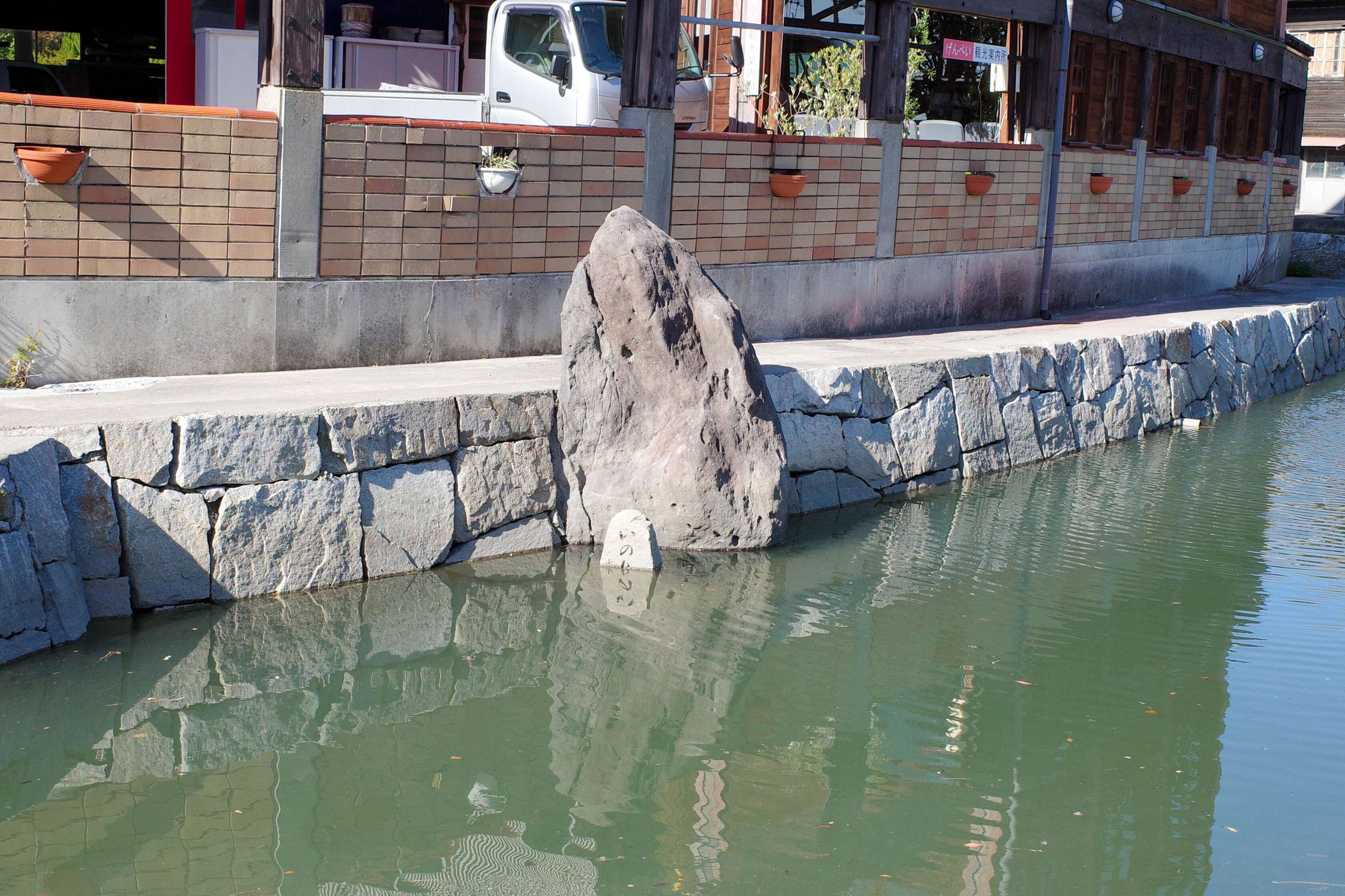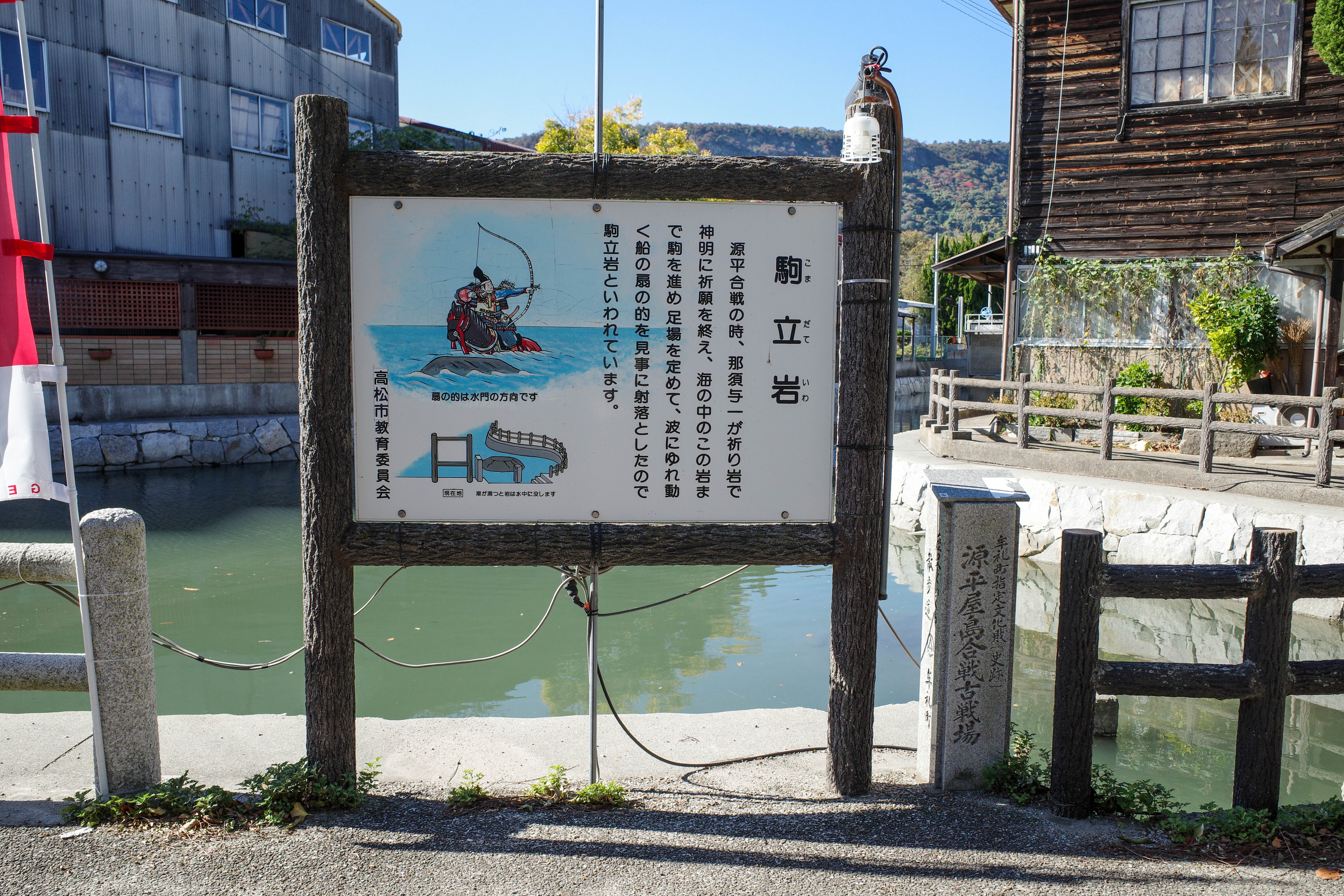 上の看板の写真、看板の右下あたりに見えている岩が那須与一が足をかけたとされる岩です。もう少し岩に寄ったお写真が次のお写真になります(水嵩が高くて見づらいですが...)。